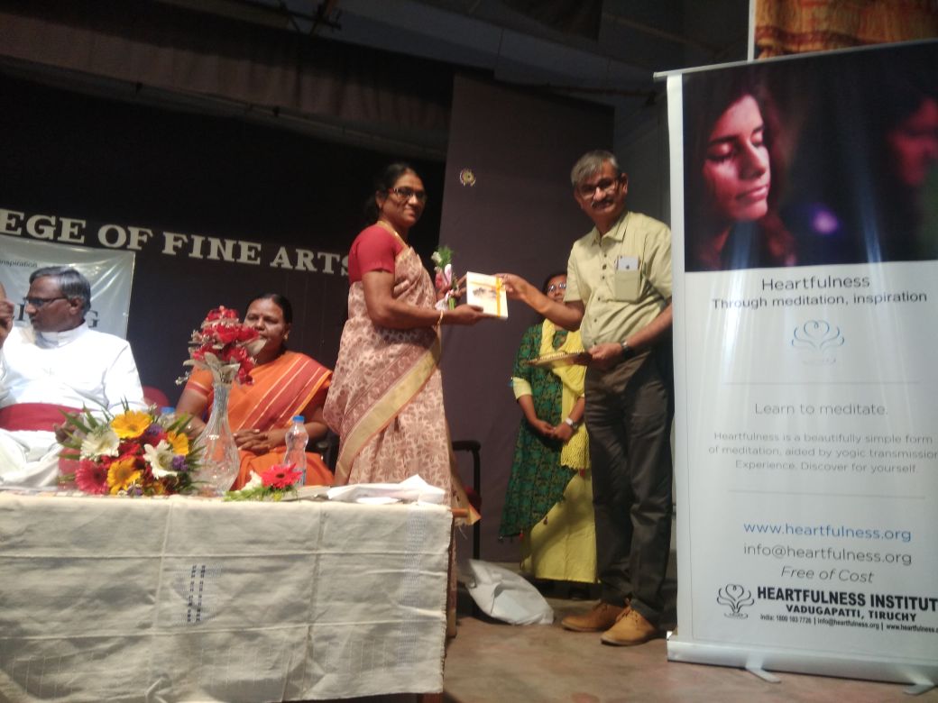 Ms. Kalpana, Principal of JR Polytechnic addresses the gathering. She spoke of the Trichy Heartfulness team slowly but surely wormed its way into the heart of her institution. She went on to reveal the specific changes the Heartfulness experience brought in the attitude of her students. Our team has been conducting Heartfulness sessions at her college since 3 years.
